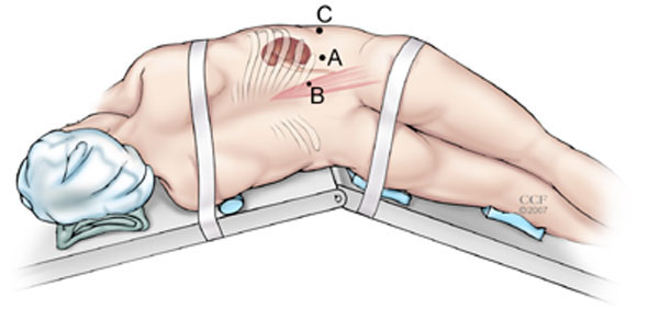 Port placement during right retroperitoneal radical nephroureterectomy. (A) primary 10-mm port is placed at the tip of 12th rib. (B) 10-/12-mm port is placed at junction of lateral border of the erector spinae muscle with lower edge of 12th rib. (C) 10-/12-mm port is placed three fingerbreadths cephalad to iliac crest, between mid and anterior axillary lines.