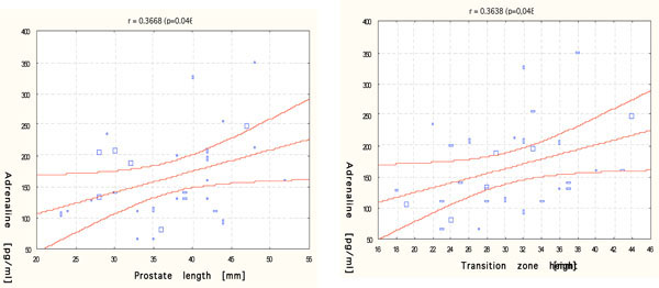Additionally, our results obtained a positive correlation between the serum adrenaline level and prostate enlargement: prostate length and transition zone height (Fig. 2).