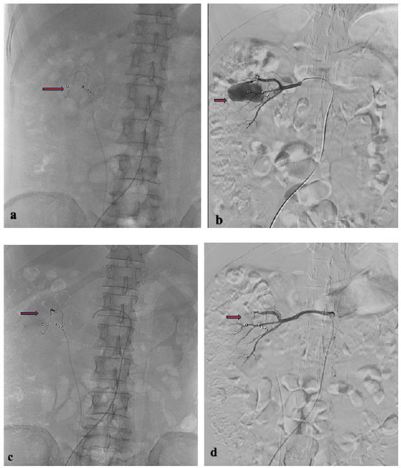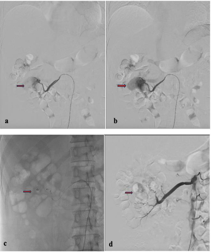 Angiography with a Cobra catheter and microcatheter. (a, b) Pseudoaneurysm in the right renal middle pole segmental artery; (c) Superselective embolization; (d) Angiography after embolization showed the bleeding artery is successfully occluded.