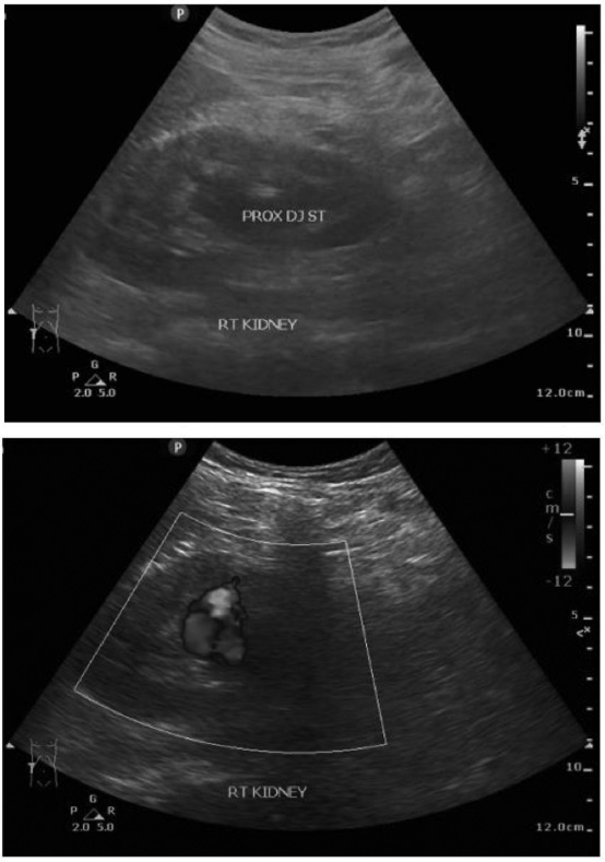 Pre-embolization ultrasound showing a decrease in vascularization in the right kidney with moderate hydronephrosis.