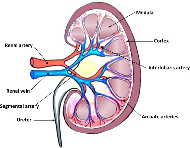 Understanding the anatomy of the renal vasculature is crucial for pre-procedural planning of renal artery embolization [9]. The renal arteries originate from the aorta abdominalis, which is situated underneath the commencement of the superior mesenteric artery, typically between the superior endplate of L1 and the inferior endplate of L2 [15]. Adjacent to the renal hilum, each renal artery bifurcates into an anterior and a posterior branch and then bifurcates into the segmental arteries that supply the upper, middle, and lower poles (Fig. 5). Upon division into two, these segmental arteries transform into lobar, interlobar, arcuate, and interlobular arteries [9].